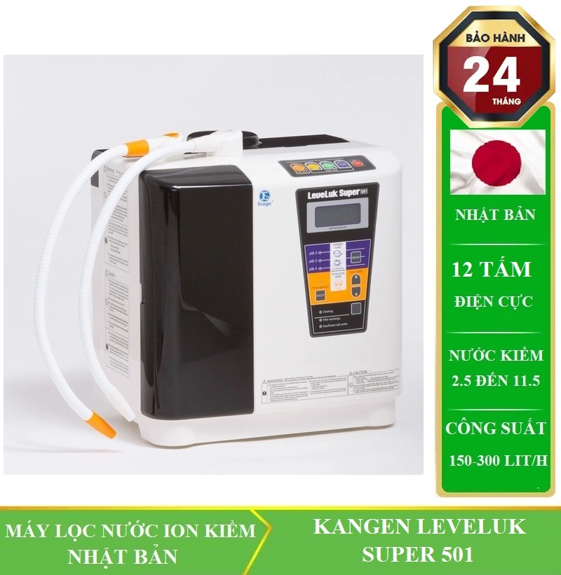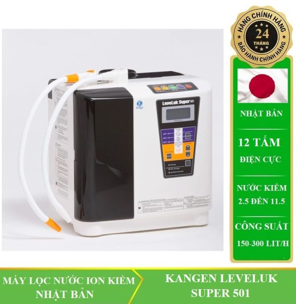 Máy lọc nước ion kiềm Kangen Leveluk Super 501 là dòng máy điện giải bền nhất, lớn nhất, và mạnh mẽ nhất của Enagic Nhật Bản. Nước sau khi được lọc sạch các tạp chất, kim loại nặng, kim loại nặng, vi khuẩn, qua quá trình điện phân sẽ tạo thành nước ion kiềm Kangen có vị dịu mát và rất tốt cho sức khỏe. Sản phẩm được cấu tạo bởi 12 tấm điện cực nguyên khối chia làm 2 buồng riêng biệt, có khả năng tạo nước y khoa 2.5 pH và nước ion kiềm với tốc độ và hiệu suất cao.